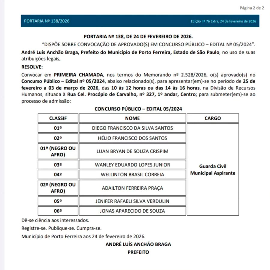 Com essa convocação, a Guarda Civil Municipal de Porto Ferreira passará a contar com um aumento superior a 20% em seu efetivo, um avanço significativo que demonstra responsabilidade, planejamento e, acima de tudo, compromisso com a segurança da família ferreirense.