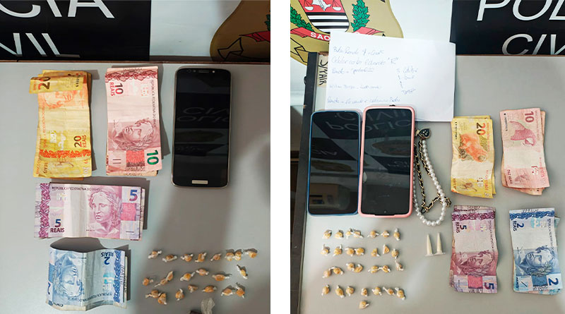 Já no segundo endereço, foram encontradas porções de cocaína, pedras de crack e uma pequena quantidade de maconha, além de aparelhos celulares e valores em dinheiro.