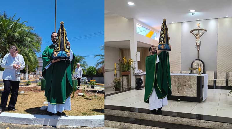 Padre Diego fez a Benção da Nova Imagem durante a Missa e em Procissão foi colocada na Cúpula de Vidro, onde fica agora abençoando nosso povo Ferreirense e também aos Turistas que passam pela Zona Sul de Porto.