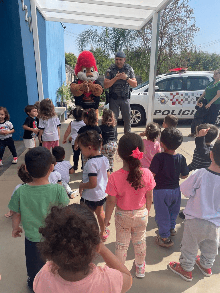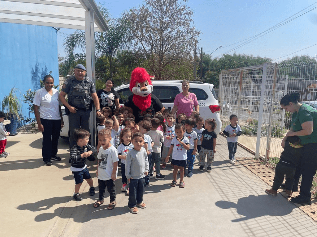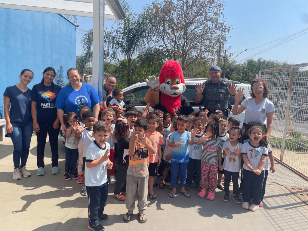 Na ocasião, o Cabo PM Osni esteve acompanhado do mascote do programa, o Leão Daren, que levou alegria às crianças. Além disso, os alunos tiveram a oportunidade de conhecer de perto uma viatura da Polícia Militar, entrando no veículo e registrando o momento com fotos.