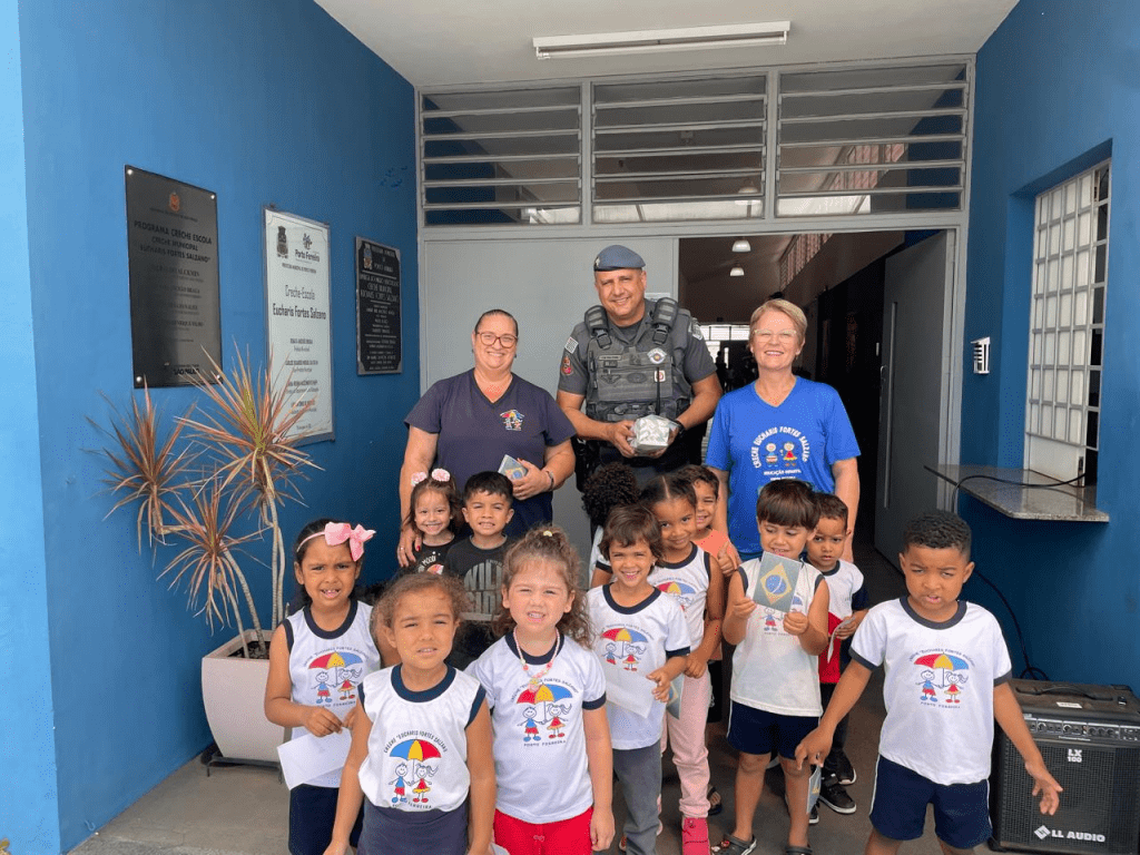 Na quarta-feira, em comemoração à Semana Nacional do Trânsito, o instrutor do Proerd, Cabo PM Osni Luciano Martins, visitou os alunos da Creche Eucharis Fortes Salzano.